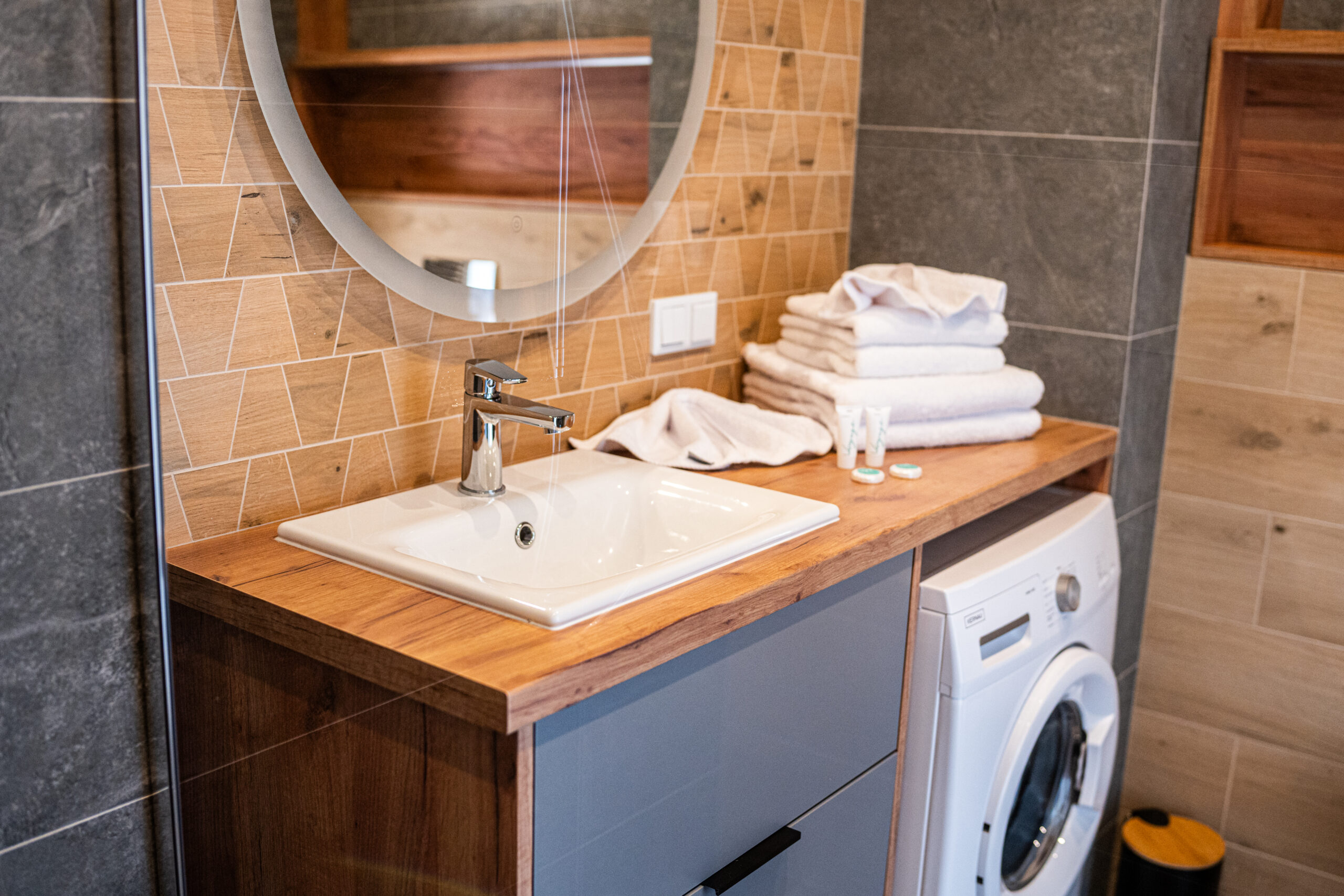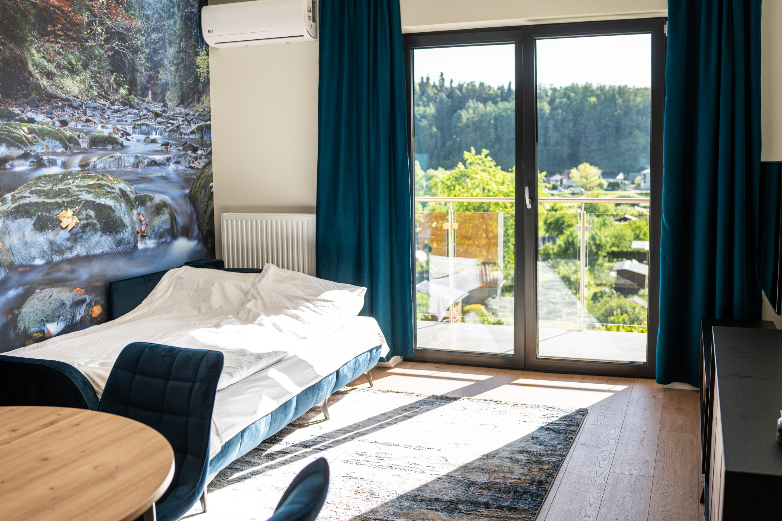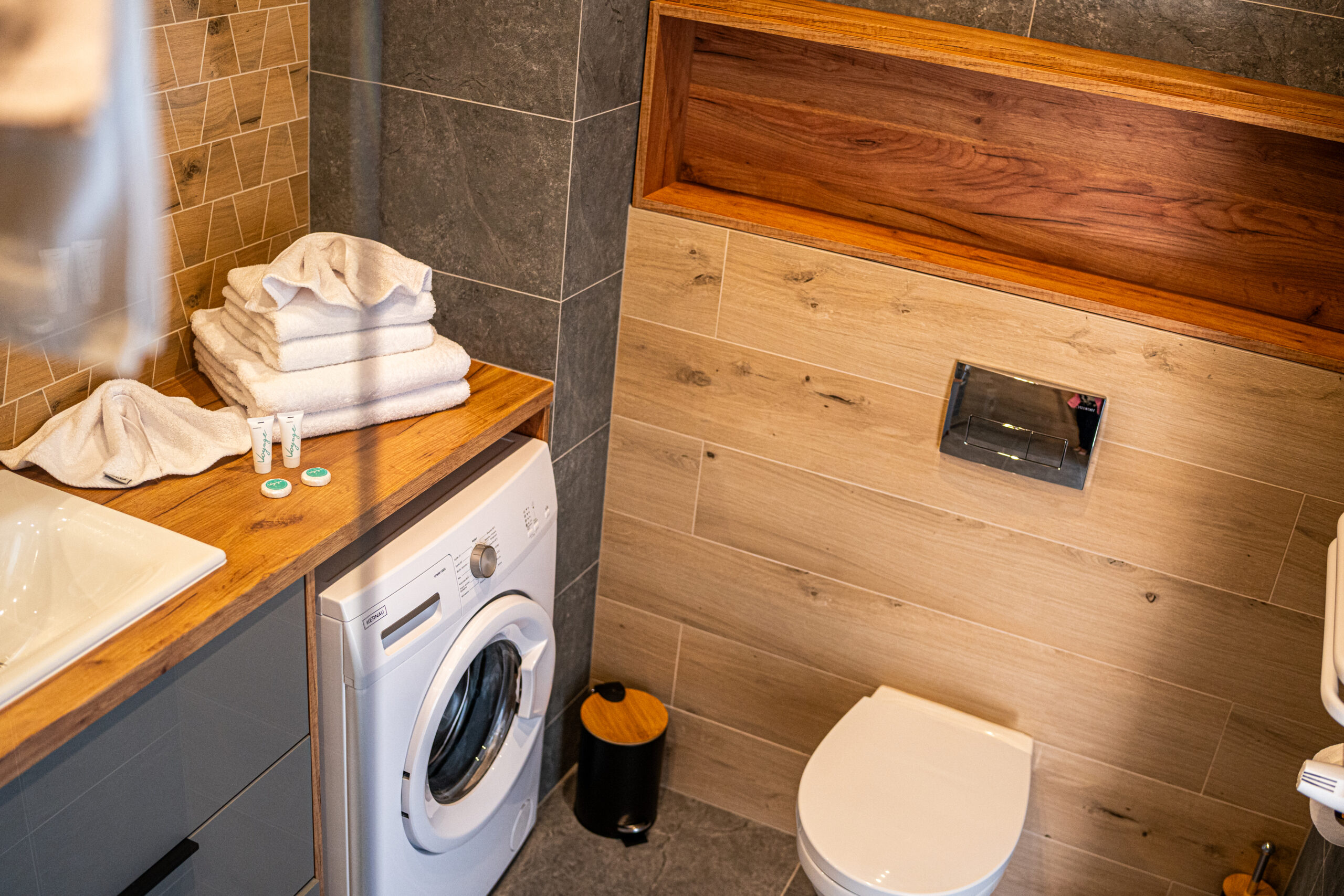 W mieszkaniu znajduje się przestronna łazienka z prysznicem, toaletą, umywalką oraz pralką. Do dyspozycji gości jest suszarka do włosów, komplet ręczników oraz zestaw kosmetyków. W salonie znajduje się telewizor z dostępem do internetu i kanałów satelitarnych. Z pokoju dziennego prowadzi wyjście na duży balkon, z którego roztacza się widok na rzekę San, okoliczne wzgórza Leska oraz ogrody działkowe.